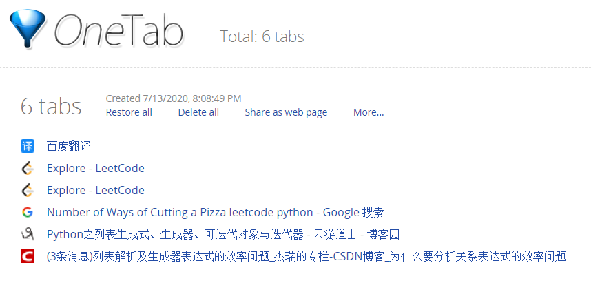 正如之前提到的,Chrome里每个插件都会开个单独的进程,每个标签页也会开个单独的进程,很占资源。使用OneTab就可以帮你把标签页收集到一个页面。