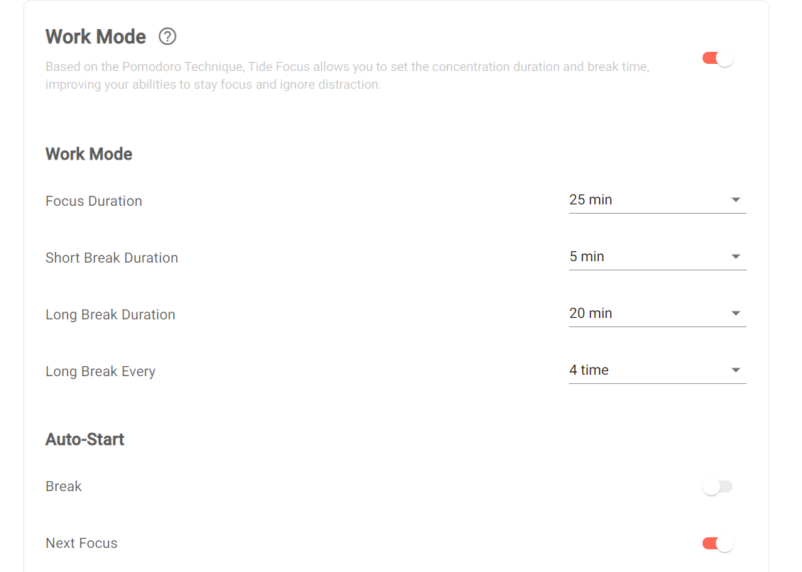 我们可以在用之前先设置自己的工作模式,每次集中多久,休息多久,每集中多少次大休息一次: